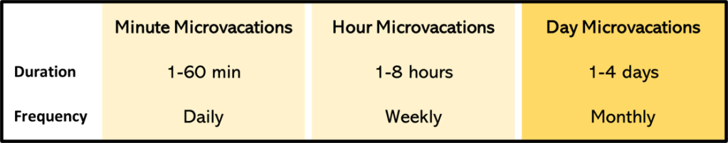 While day microvacations offer a powerful monthly reset, they work best as part of a holistic routine that includes also minute microvacations (for daily recharges) and hour microvacations (for weekly refreshes). Together, these three categories ensure your physical, mental, and social wellbeing are consistently nurtured.